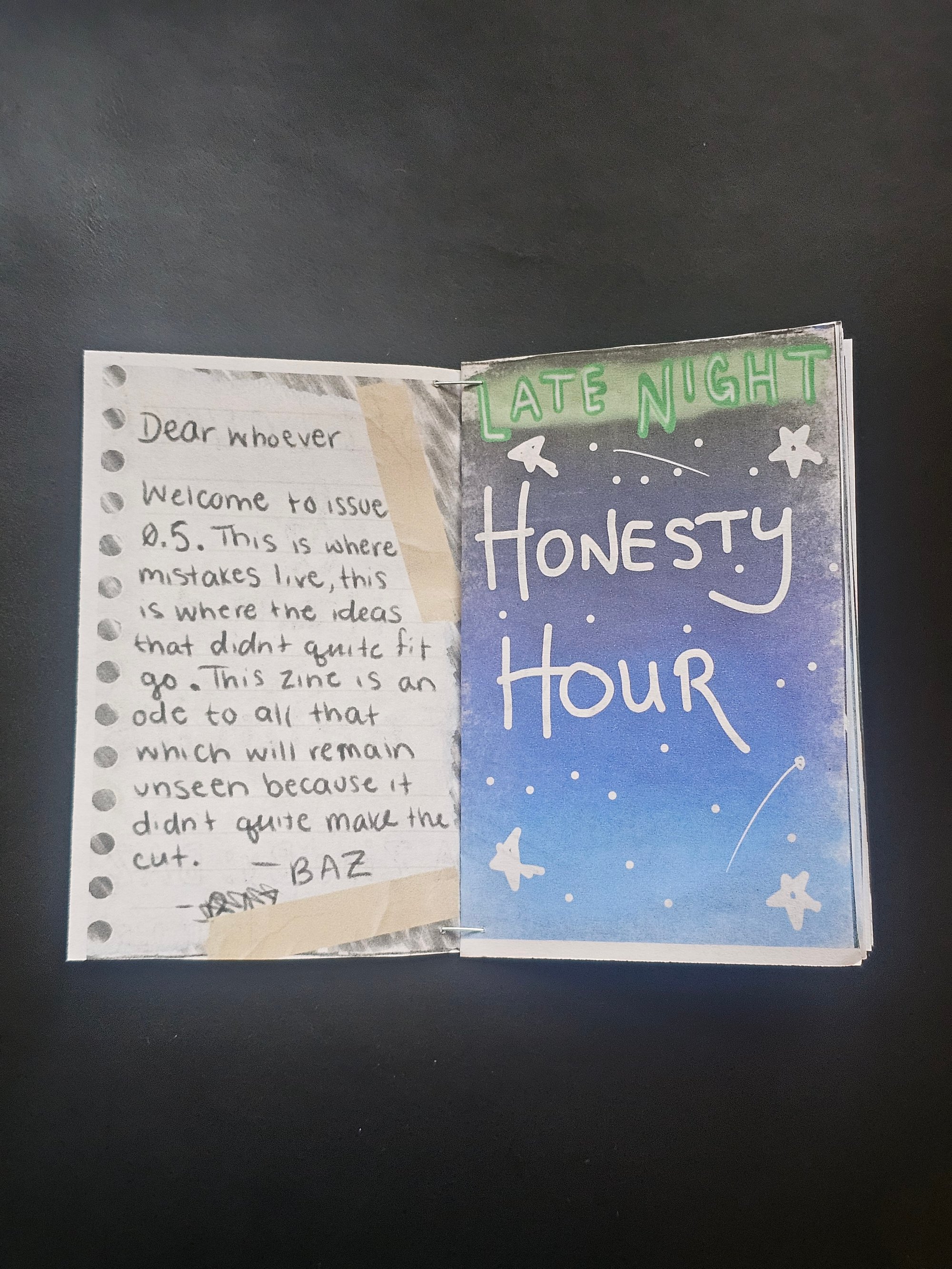 This zine is about beginnings that aren't quite beginnings yet. It's the half-formed, heartfelt, full-feelings stage of making something new. This issue holds the scraps, the drafts, the almost-made-its; It's a home for the parts of ourselves that don't always make the final cut -- the messy, the too-tender, the not-ready-yet... but should maybe still be seen anyway.